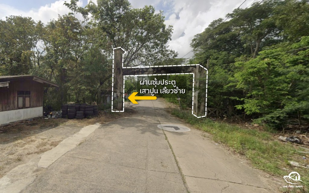 - ขับผ่านซุ้มประตูแท่นปูนซีเมนต์ เลี้ยวซ้ายแรก