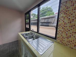 ในห้องครัวก่อเคาท์เตอร์ครัว ซิงค์ล้างจานเรียบร้อย ส่วนครัวและส่วนห้องนั่งเล่น มีประตูกั้น กันกลิ่นรบกวน