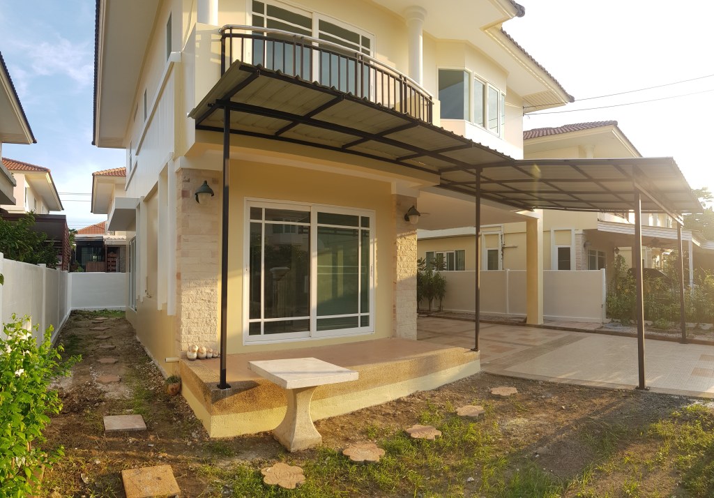 ถนนหมู่บ้านกว้าง จอดรถสะดวก ในบ้านจอดรถได้ 1-2 คัน มีต่อเติมหลังคาโรงรถหน้าบ้านเรียบร้อยแล้ว
