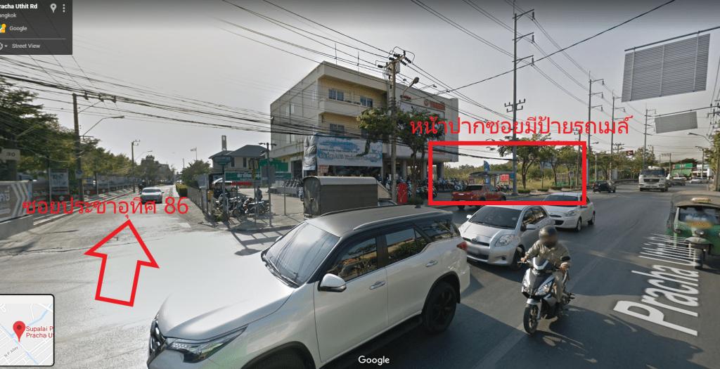 หน้าปากซอยประชาอุทิศ 86 มีป้ายรถเมล์ ขึ้นสาย 21 , สาย 88